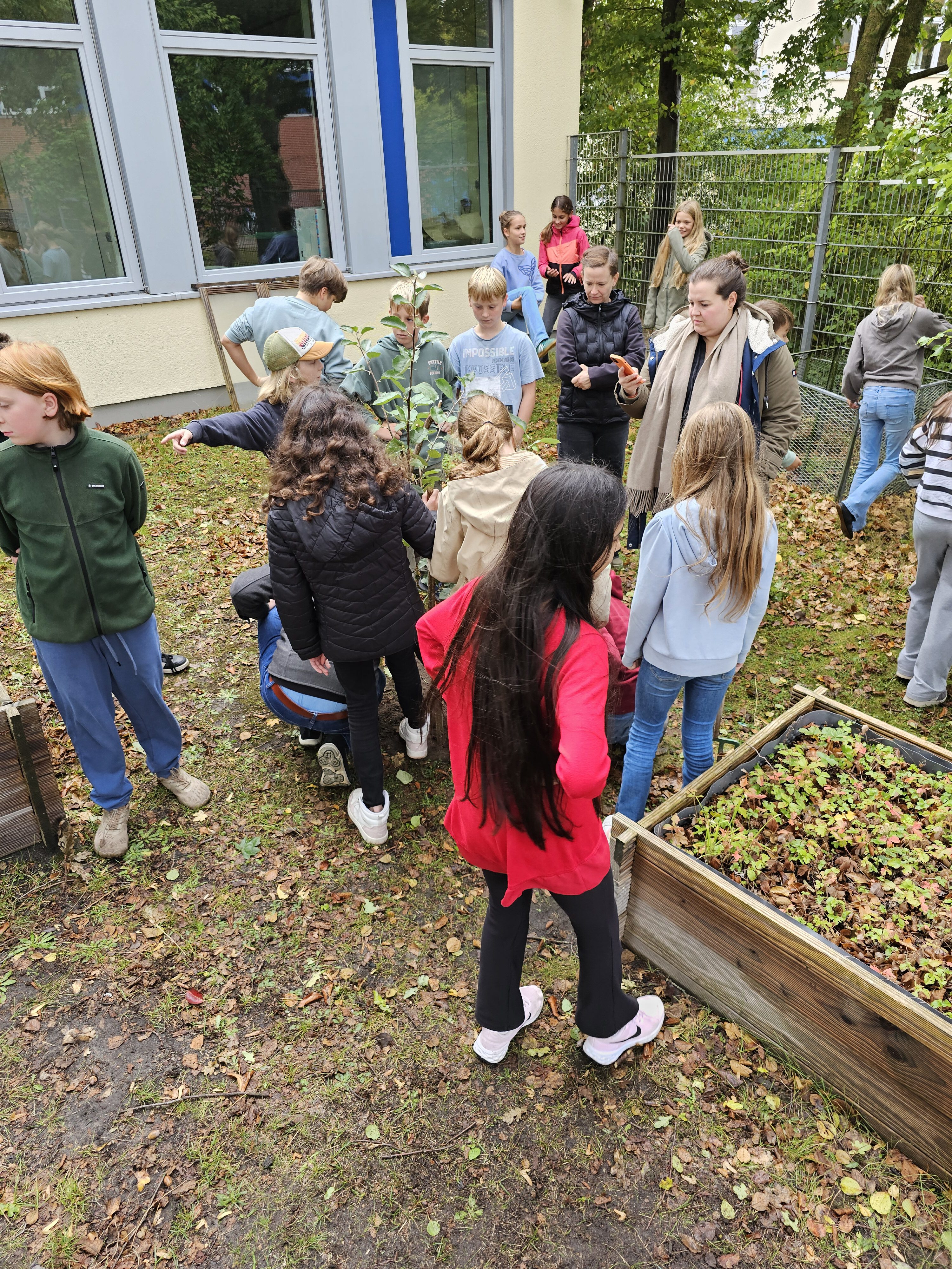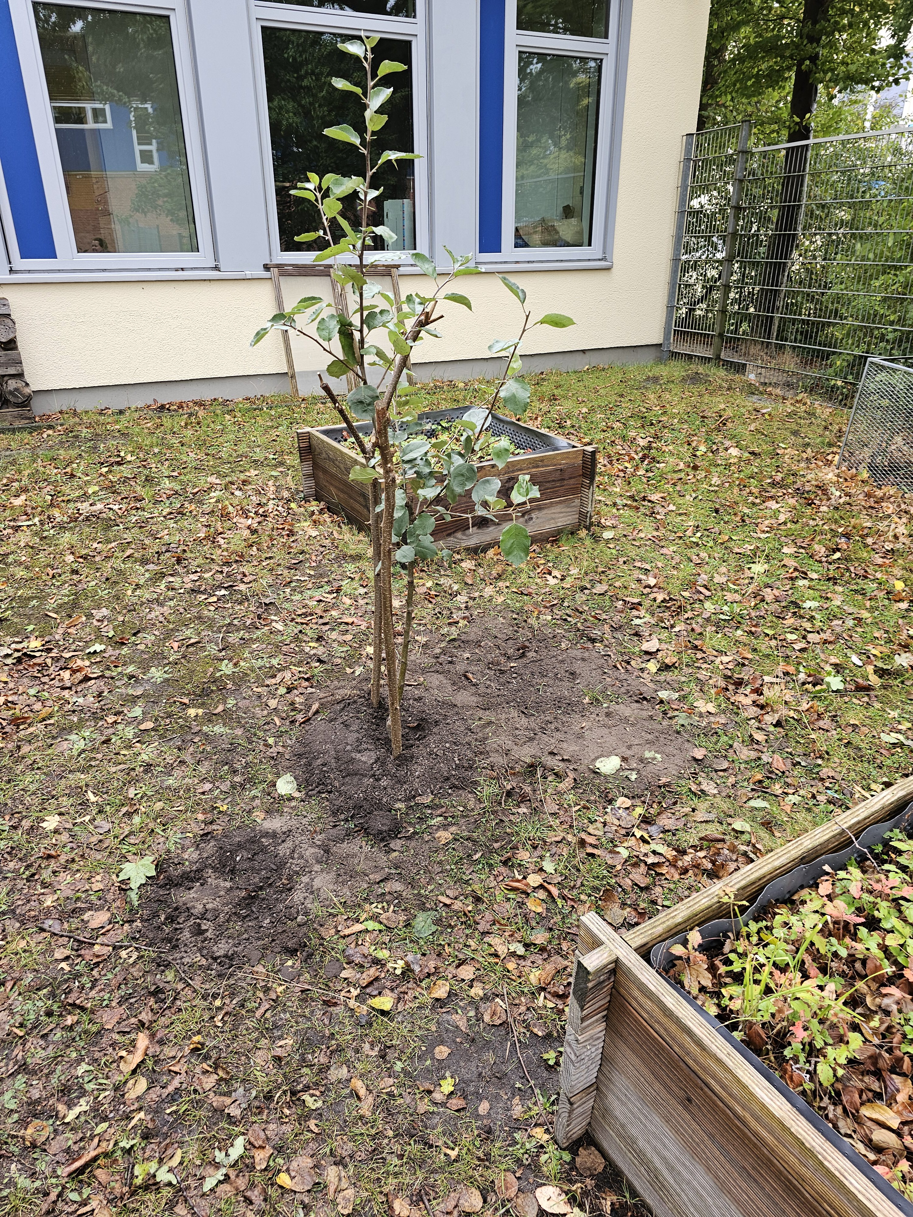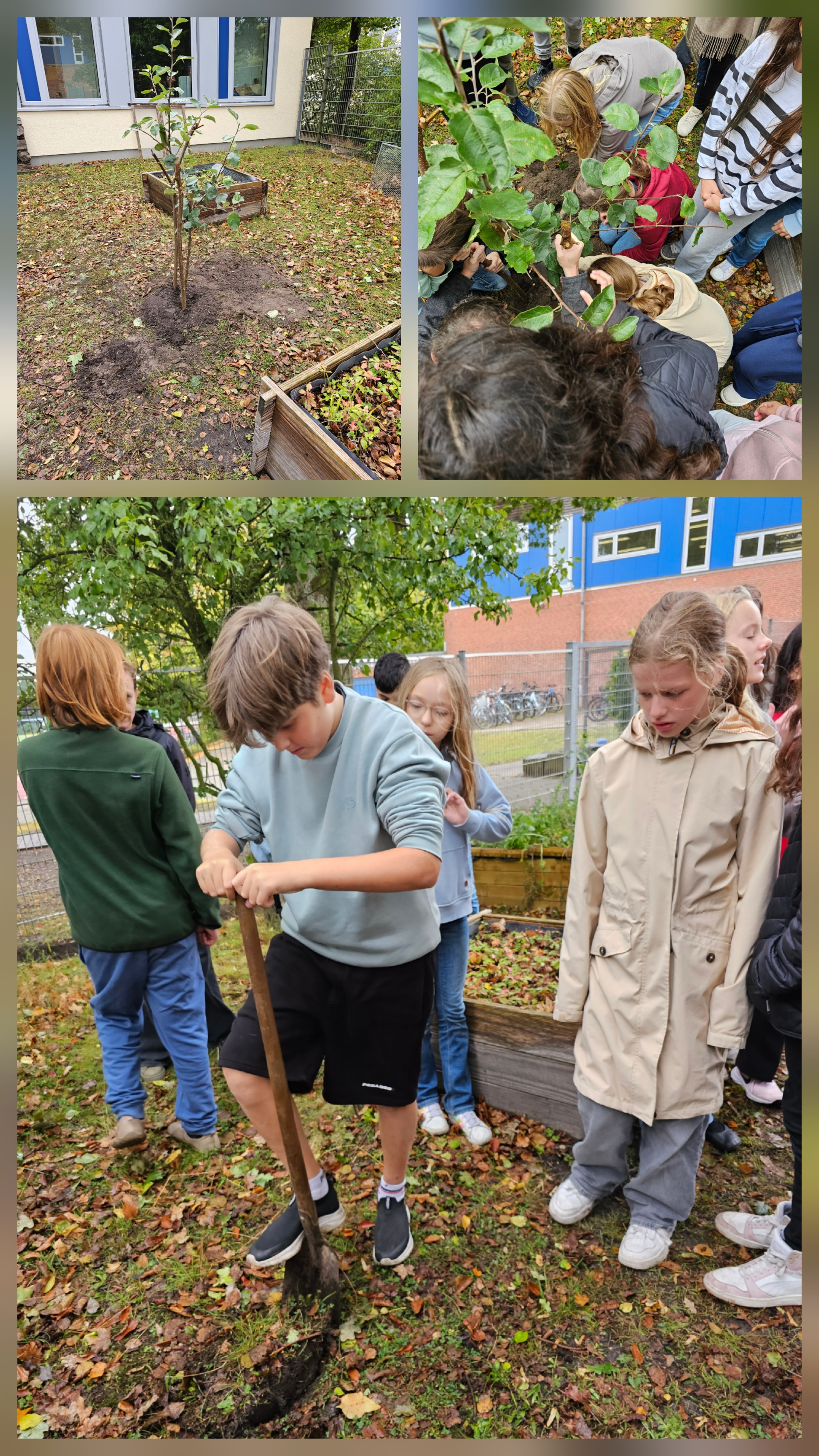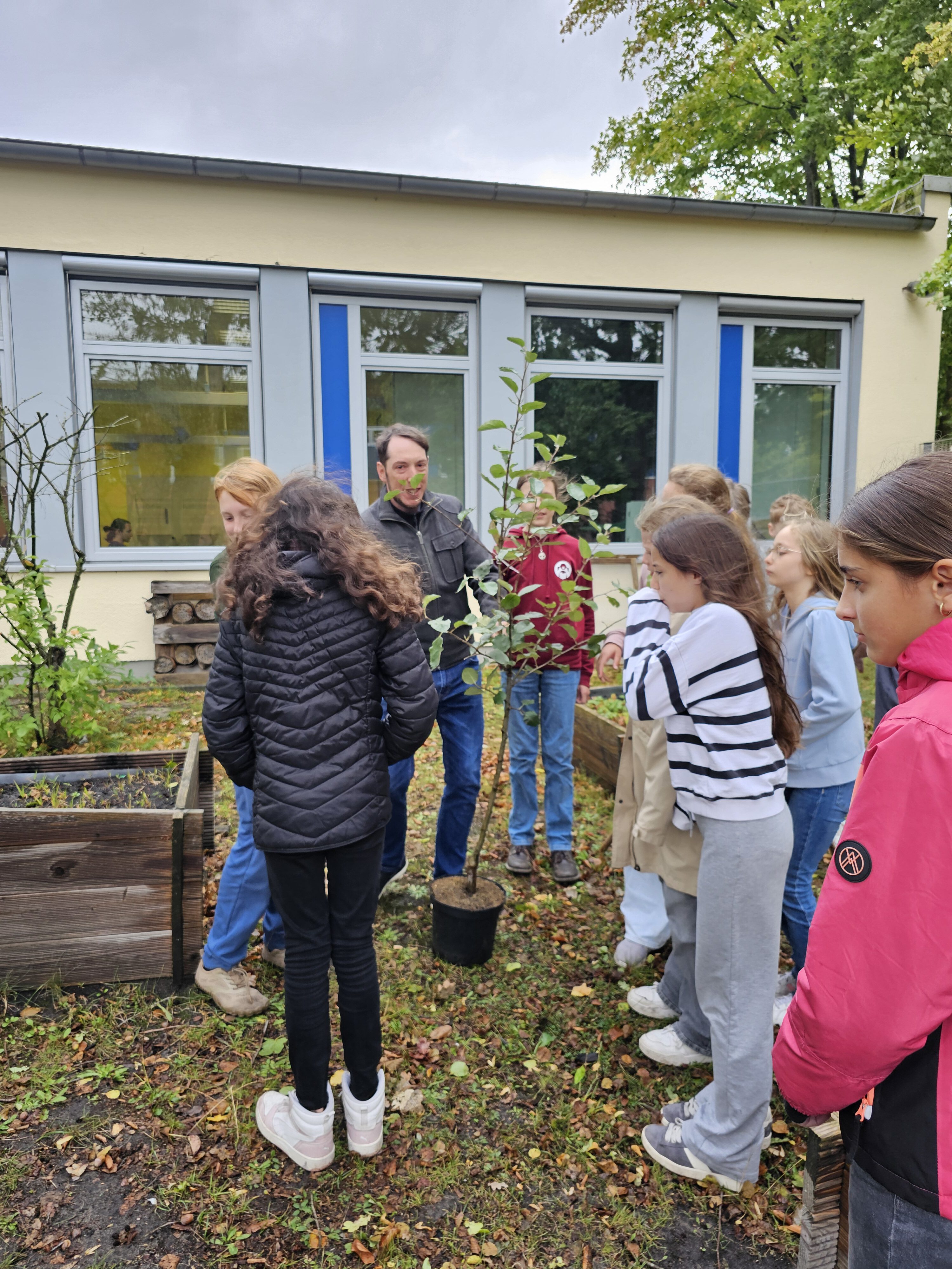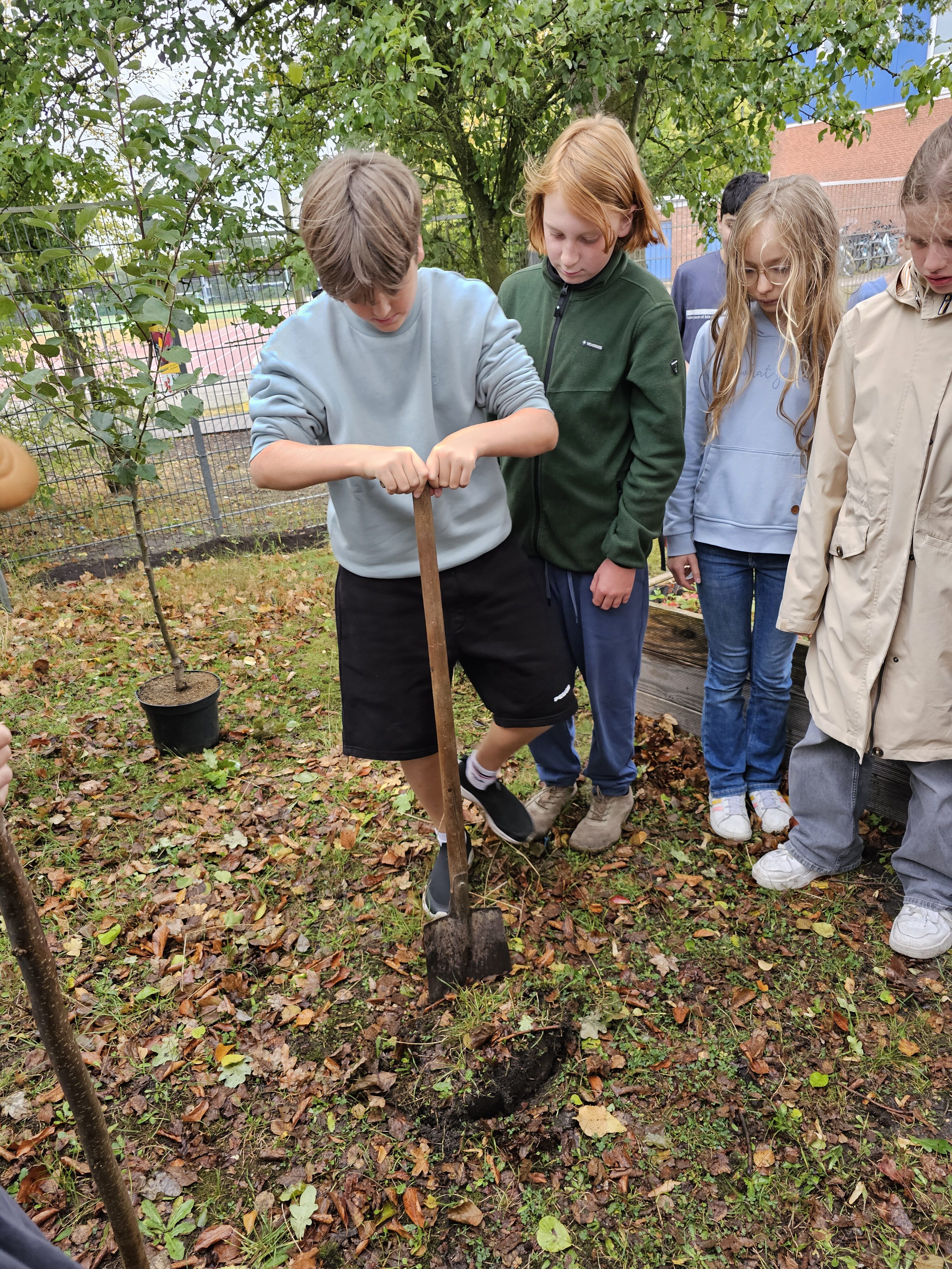 Wir sind von der IGS Buschhausen zur Baumpflanzchallenge eingeladen worden und haben diese Einladung gerne angenommen. Vor zwei Wochen hat Herr Dr. Bartels einen Apfelbaum besorgt, den wir sehr gern eingepflanzt haben. Damit leisten wir nicht nur einen positiven Beitrag zur Kohlenstoffdioxidbilanz, sondern können auch bald leckere Äpfel ernten.
