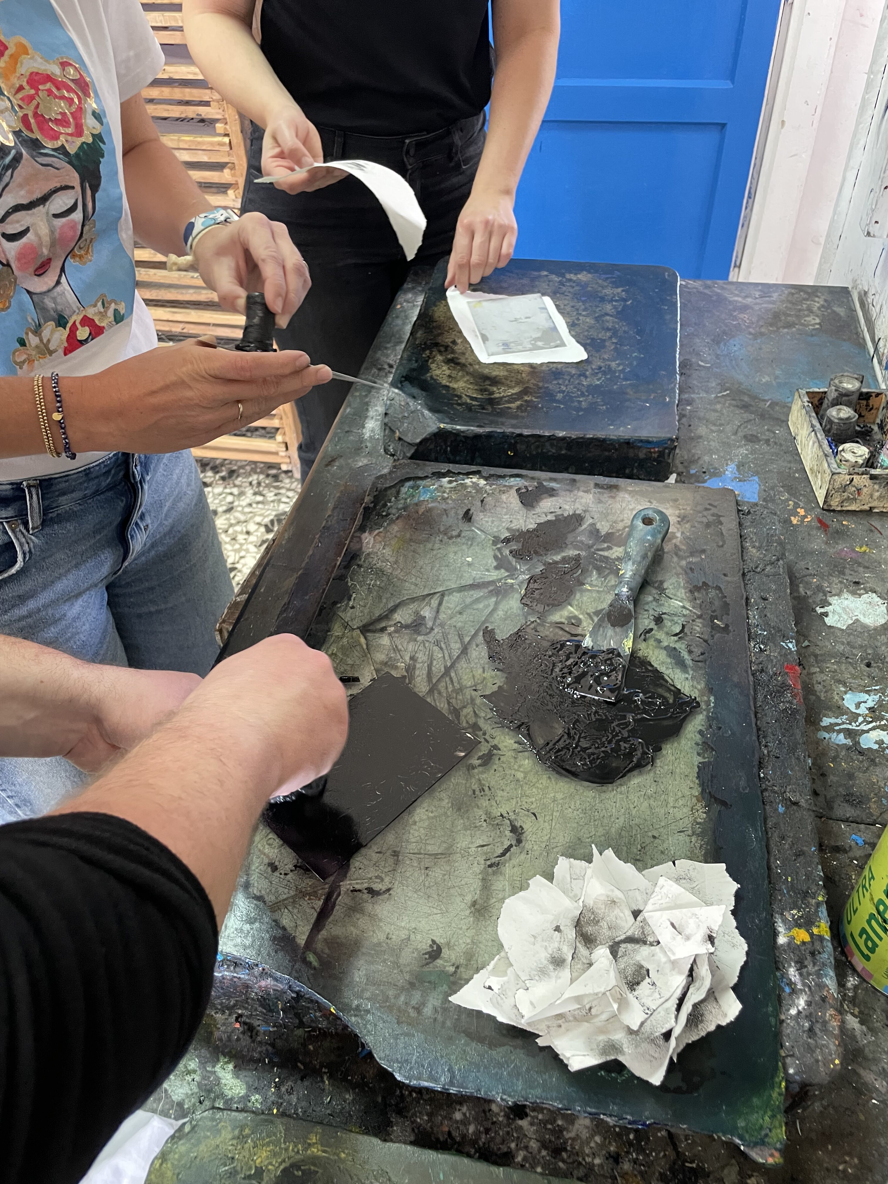 Neben Unterrichtshospitationen und Gesprächen mit den Lehrkräften und Schüler:innen vor Ort bestand auch die Gelegenheit, selbst praktisch tätig zu werden. In verschiedenen Drucktechniken, in den Bereichen Malerei und Zeichnung sowie in der Keramik konnten künstlerische Prozesse unmittelbar erlebt werden. Diese aktive Teilnahme ermöglichte authentische Einblicke in den Schulalltag und die kreative Arbeitsweise vor Ort.