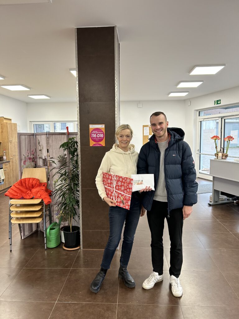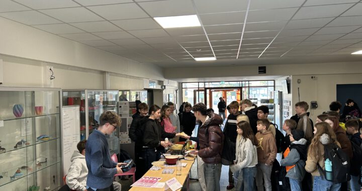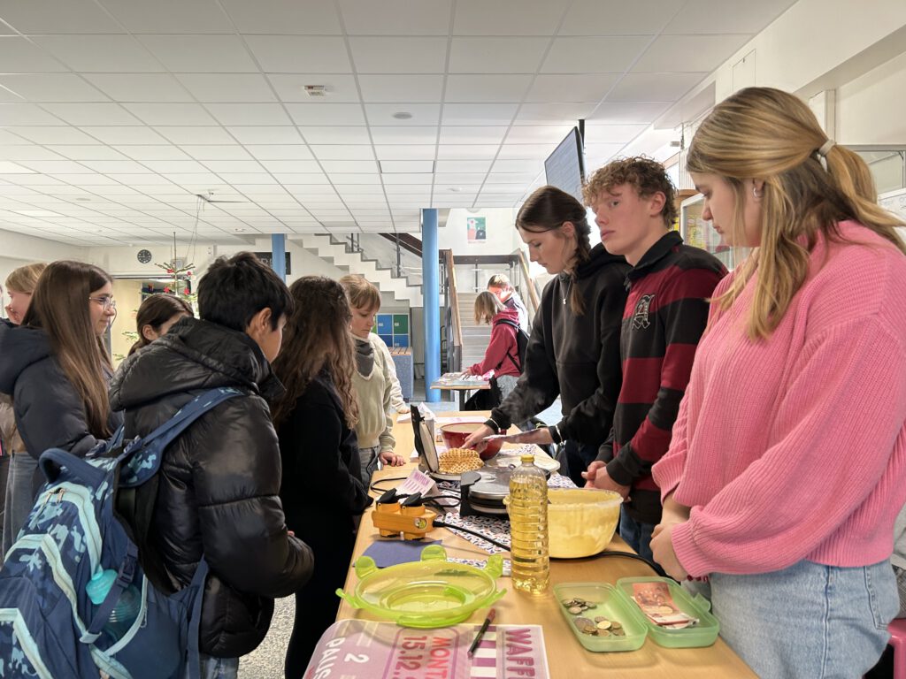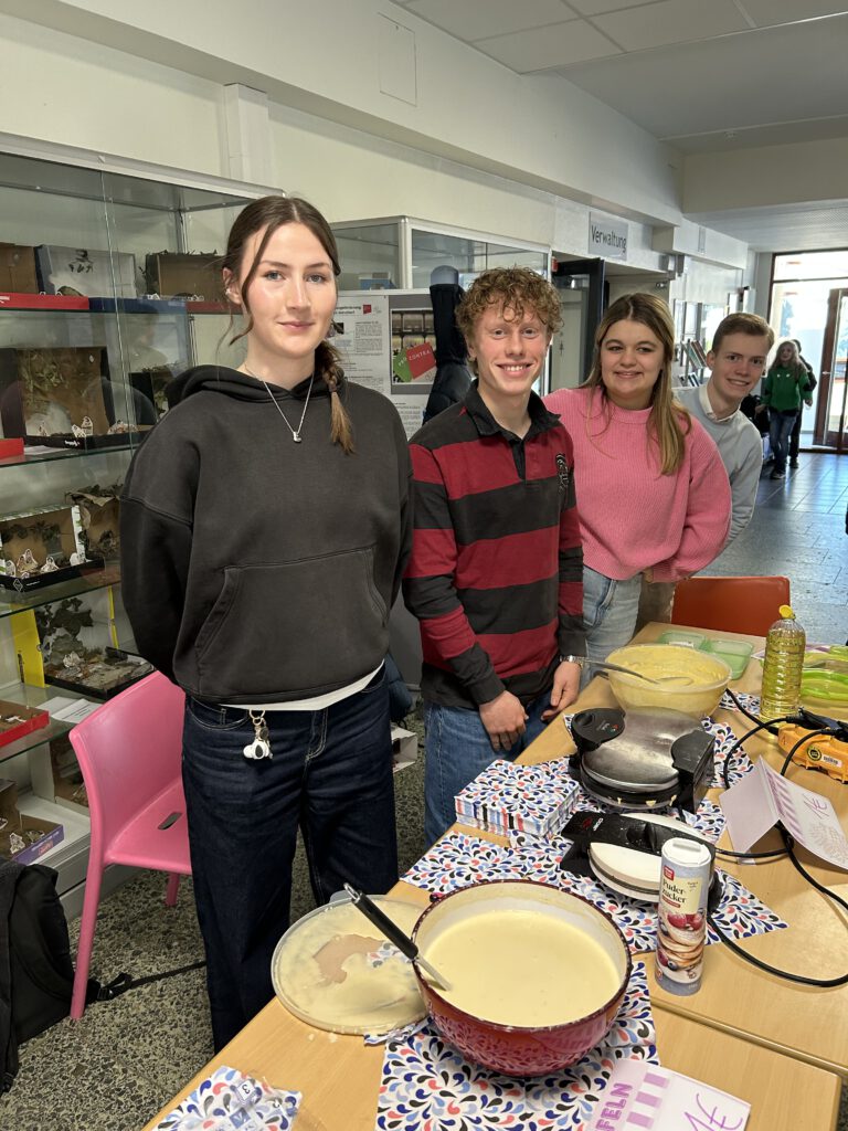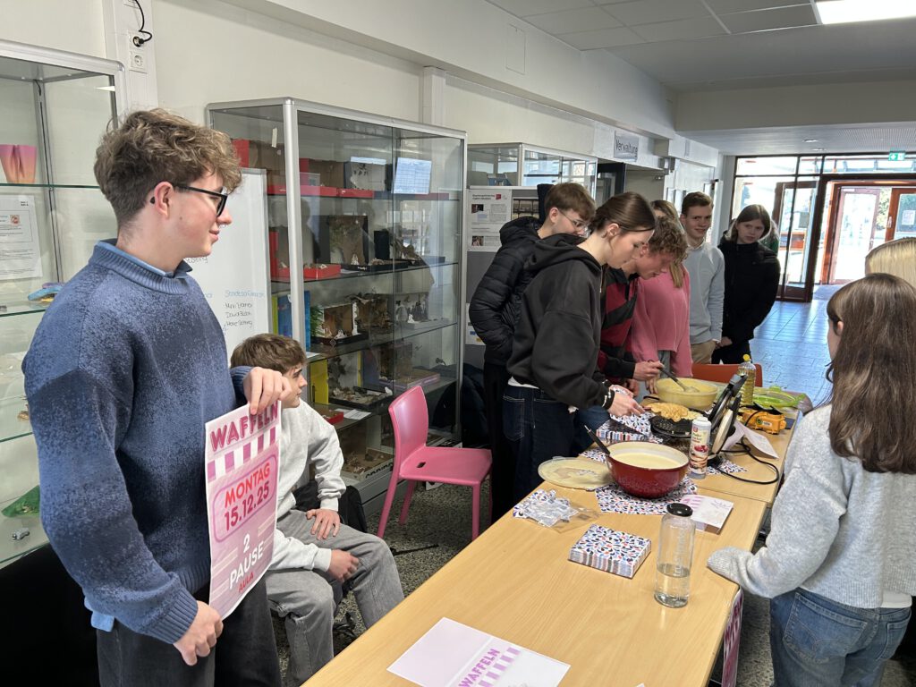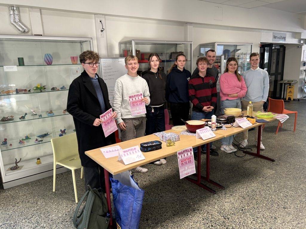 Im Frühjahr 2025 durfte der Leistungskurs Politik-Wirtschaft im Rahmen des Unterrichtsthemas „Soziale Marktwirtschaft zwischen Anspruch und Wirklichkeit“ die Tafel OHZ besuchen. Im Gegenzug versprachen die Schüler:innen, vor Weihnachten einen Waffelverkauf zugunsten der Tafel zu starten. Dabei kamen stolze 70 Euro zusammen, die Frau Müller von Linus freudestrahlend entgegennahm. Wir bedanken uns ganz herzlich bei Frau Müller und Frau Kohlmann für die Führung durch die Tafel und bei den vielen Schüler:innen, die unsere Waffeln gekauft haben.
